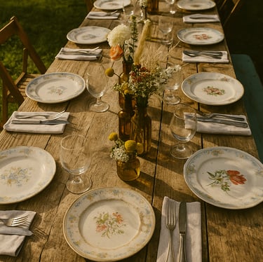 Assiettes anciennes, verres ciselés, couverts patinés : chaque pièce a vécu, chaque détail compte.